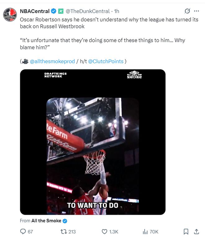 NBA名宿奥斯卡-罗伯特森在参与一档节目时也力挺威少应该继续留在NBA打球,大O表示:不明白为什么NBA没有球队想要签下威少,很遗憾联盟对他做出这样的事,如此出色的他为何被冷遇,为何要用一些莫须有的问题来责怪他呢?